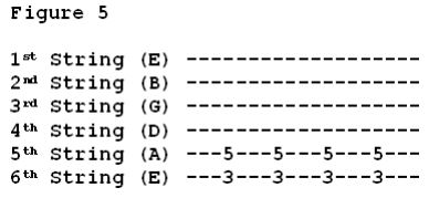 What you should practice for this week is the Figure 5 tablature below. For this, you will be using "downstrokes." A downstroke is exactly what it sounds like- you stroke your pick in a downward motion on the two notes at the same time.